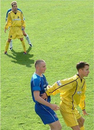 Left: Kieran Lugsden (in yellow) is tightly marked by Ben Smith, whilst in the background Colin Little is also being closely watched by his opponent.