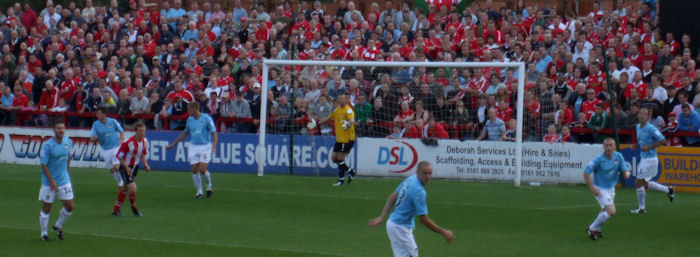 Altrincham then won a corner when Doughty's freekick came via Young to Little, whose shot, as he fell, was deflected out of play. From the corner Young headed wide (28 mins). McGregor continued to impress against his former employers and Battersby too was doing well on his first outing of the season. When Danylyk lost his boot in making a shot, he picked it up and played on with it in his hand, an offence which cost Alty dear two seasons ago when Chris Senior did the same and was sent off the pitch by the referee to put it back on, allowing Stafford to score. Wrexham then threatened as Aiston surged forward and found Louis in space to his left but the striker shot weakly and wastefully, some twenty feet over the bar (35 mins).
