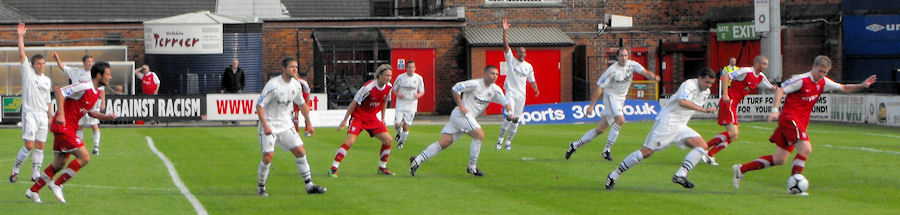 The linesman's flag was already raised well before York put the ball in the net moments later but it soon took a fine tackle from Densmore to stop another York probe. Holsgrove then rode his luck, having already been spoken to, he needlessly upended an opponent as the York man shepherded the ball out of play. Again the ref decided a lecture was sufficient punishment (34 mins).