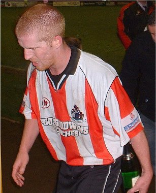 Left: Chris Adams seems to be thinking what might have been after the game. Right: Eddie Hussin leaves with the Man of the Match champagne after another hardworking performance.