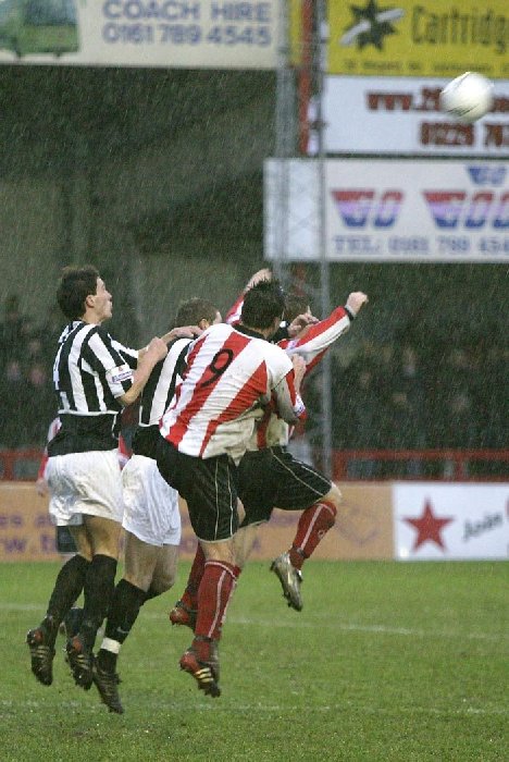 AND WHEN IT RAINED...Left: In the pouring rain against Stafford last Saturday, Alty assistant manager Dalton Steele suddenly realises why manager Graham Heathcote nowadays sits in the stand. Picture courtesy of Gavin Rathbone, whose excellent photographic products can be bought in the Robins' Shop - details here. Lower, left: Marcus Hallows and Gary Scott challenge for an aerial ball against Stafford in another of Gavin Rathbone's superb shots.