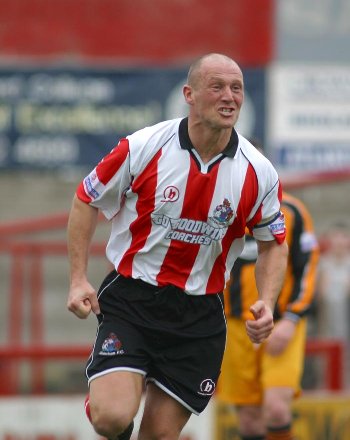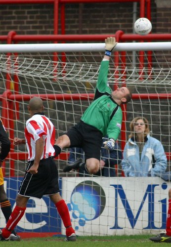 Below are two wonderful photos from Gavin Rathbone showing (left) Stuart Coburn tipping Paul Barnes's effort over the bar and (right) Alty captain, Gary Talbot celebrating his headed goal. Copies of Gavin's photos are available via the club shop or by e-mail.
