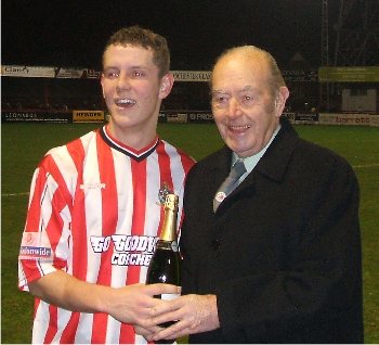 Right: Lewis Chalmers, a deserving Man of the Match, receives his award from Alty supporter Stan Riley.