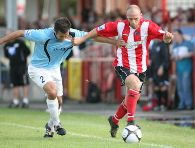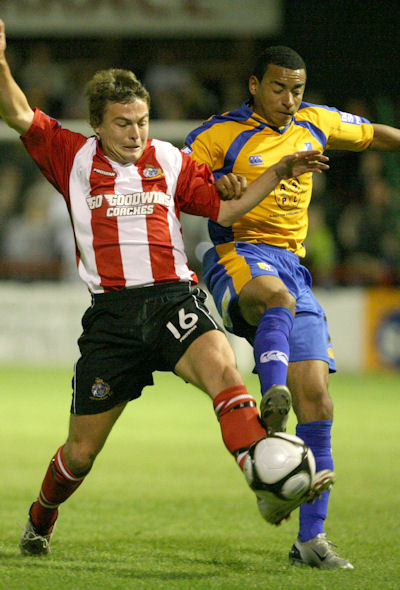 NL Daily reports that "Altrincham have signed former Blackpool midfielder Paul Tierney (right, seen making his debut) in an attempt to improve their start to the season. Manager Graham Heathcote's year-long pursuit of the 25-year-old eventually proved successful, as the club look to end a five -game run without a win. He said: 'I tried to get Paul on loan when he was at Blackpool last season, but it didn't happen. He has had spells with Stockport on loan and Bury but has finally decided to give it a go part-time with us'. Tierney can play either at left-back or on the left side of midfield and went straight into the squad for Tuesday's 1-0 defeat at Histon. Heathcote now may have to sacrifice another player to balance the books. He said: 'I'm not happy with our points total and felt something had to be done. I don't know whether the budget will stretch to another player, but I have seen seven games now, and there is no getting away from it - we should have a far healthier return'".