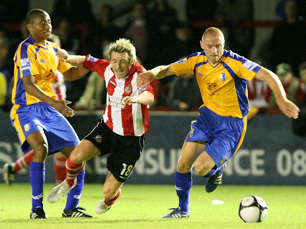Right: Gavin Rathbone captures the effort from Anthony Danylyk in the win over Mansfield. Copies of Gavin's photos are obtainable via the Robins' Shop or his GR Photography website. Alty are away at Rushden tonight. Last season the Robins lost 1-0 to a Michael Rankine goal. Their side that day is below. 1. Stuart COBURN; 16. Ryan SHOTTON, 5. Darren TINSON (capt), 10. Greg YOUNG, 24. James JENNINGS; 23. Ryan TOULSON, 7. Robbie LAWTON, 25. Liam KING, 11. Warren PEYTON; 9.Colin LITTLE, 14. Tom CAHILL. Subs: 3. Gary SCOTT, 12. Joe O'NEILL, 15. Chris LANE, 17. Richard BATTERSBY, 19. Chris SENIOR.Only five of that starting line-up (Coburn, Young, Lawton, Peyton and Little) remain at the club. Rushden, too, are much changed, but seven of last season's starters against Alty remain at the club. New faces include Daryl Clare, Lee Phillips and the on-loan Manny Panther, but the ex-York man is suspended tonight.