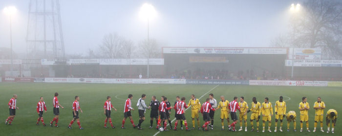 The fog got worse as Saturday's match progressed; here the players greet each other before kick-off.