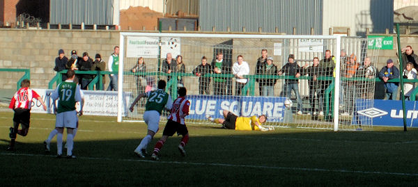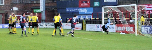 Above: Colin Little, off picture, sees Scott Tynan save his penalty kick.