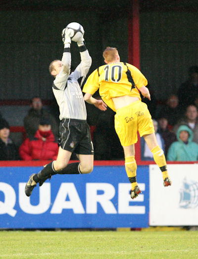 Right: Anthony Danylyk in acrobatic action at Northwich, as Shaun Densmore waits for the outcome.