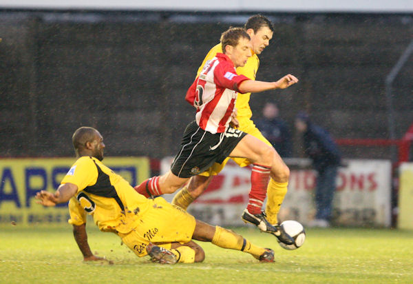 The Northants Evening Telegraph reports that "A controversial sending-off allowed Rushden & Diamonds to record a comfortable away win. Altrincham midfielder Shaun Densmore was harshly red-carded after only 20 minutes for a late challenge which caught on-loan winger Yannick Bolasie. The Congolese youngster was perhaps fortunate to escape with a yellow card soon afterwards for a high tackle on Robins' skipper Robbie Lawton.