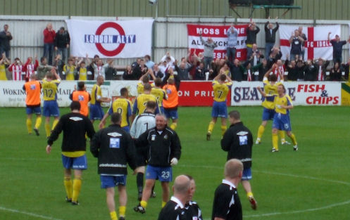 From Woking who beat our next opponents, Northwich Victoria, 4-1, on Saturday, we read "Being Woking, the victory wasn’t as straightforward as the scoreline might suggest, with the Cards nearly letting the Vics back into the game in the second half... It was worrying... to see the Vics winning headers from two early corners... It soon became apparent that the Northwich defence was pretty shaky. A horrible mis-kick from the Vics' keeper, Ryan Clarke, produced the first of a host of corners... and then a defender mis-directed a back header to give away another... The Cards went in at half-time to an unaccustomed 2-0 lead ... but the Vics started to get back into the game... [and] went straight up the other end and scored, with the giant defender Matt Bailey looping a header home just under the bar... The Vics came very close to equalising in the 69th minute... This was a very welcome win against, it must be admitted, the weakest BSP side we’ve seen this season".