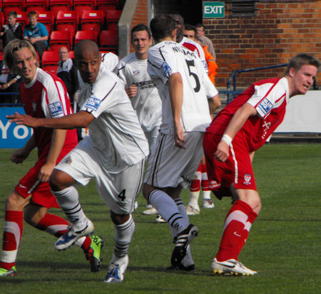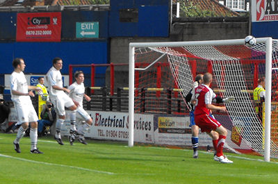 Above, during the first half, Robbie Williams outjumps everyone to head towards goal. Gary Silk (Mansfield no.4) scurries back and, moments later, heads the ball off the line with the keeper in no man's land.