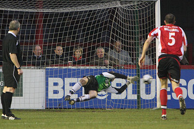 There was more controversy over the award of a penalty in the second half that resulted in a red card for Wes Baynes. You could say it possibly was a sending off, but the foul was outside the box, so it was just as well Stu prevented an injustice by saving the spot-kick.