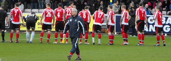 Right: All three players seen here only joined or re-joined Altrincham in the last seven weeks but all have been giving everything for the Robins' cause. Pictured at the end of the game at Darlington are Steve Connors (on loan from Fleetwood), Greg Young (on loan from York City) and Dale Johnson (re-signed last week).