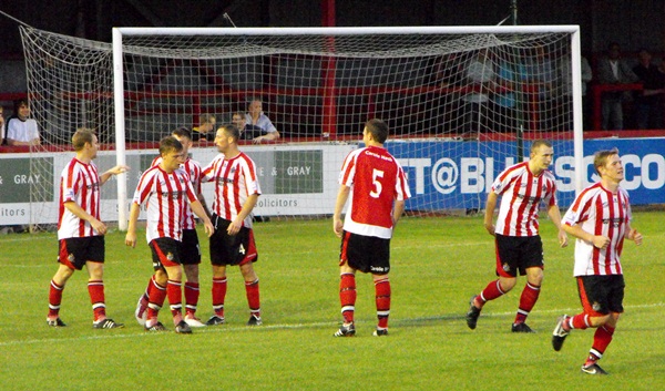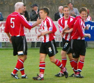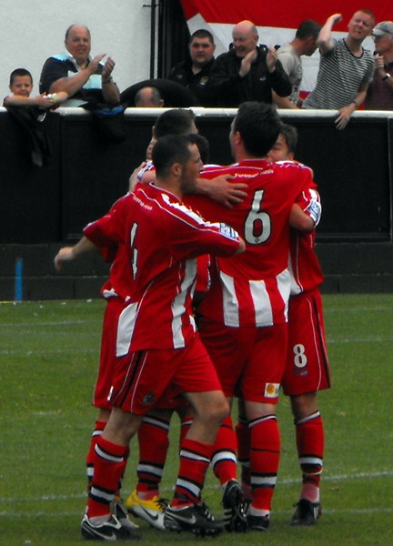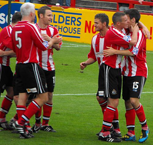 Right: Alty congratulate Nicky Clee (far left) after his goal against Barrow.