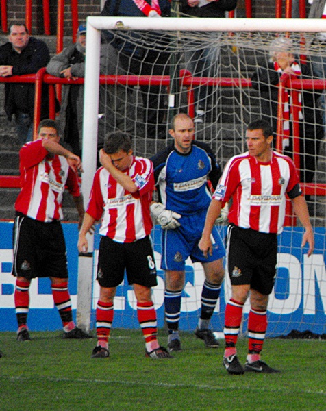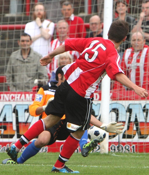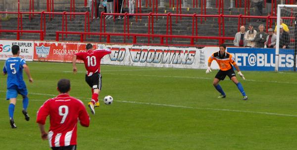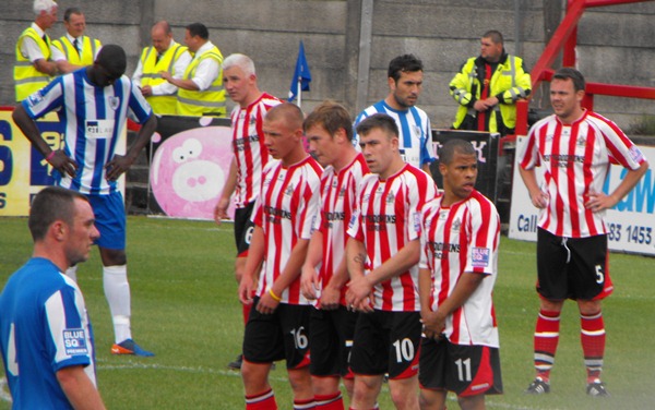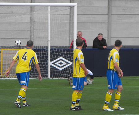 Above: Left, Alty line up a wall against the Hyde freekick, from which the ball was laid off to Spencer (no.10), who (right) hammered it into the net for Hyde's first goal.