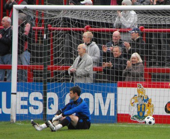 Guiseley keeper Steven Drench is seen after Alty's second goal hit the back of his net.