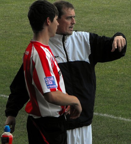 Right: Involvement of several youth team graduates has been a feature of pre-season for Altrincham; here, assistant manager Neil Tolson gives young defender Joe Coombs his instructions against a Manchester City XI.