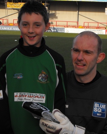 Right: Stuart Coburn makes a good stop but the referee has just blown his whistle for an Alty freekick in the match against FCUM. In the background, all of FCUM's supporters are standing in the all-seater stadium..