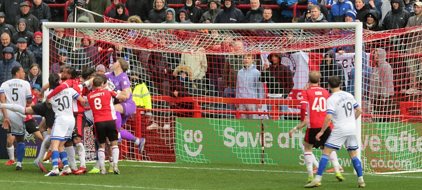 Altrincham's remaining nine men defended valiantly through more than ten minutes of added time to secure a point before there appeared to be unwelcome interaction between some Alty players and the home crowd behind their goal.