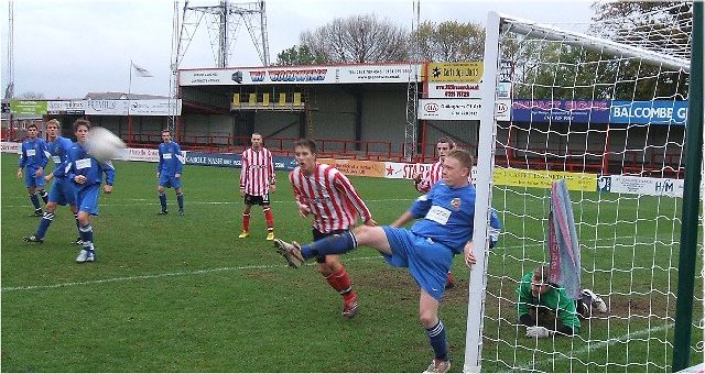 Ben Deegan is almost off the picture (right) after heading Alty Reserves' fourth goal yesterday. Lee Hendley (yellow boots) is also seen.