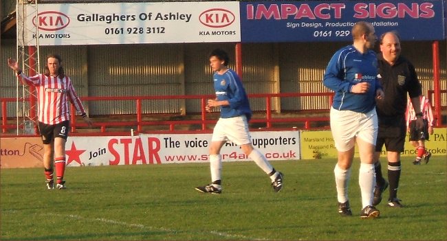 Soon afterwards, Alty chairman Geoff Goodwin, returning after a knee injury, replaced Andy Knott (31 mins) and then a fine shot from Hibbert was well saved by Jordan. McDonnell then came on for the supporters instead of Harwood. Goodwin almost put the Staff ahead when he outpaced the defence but his shot came out of the keeper's right post (42 mins). But after a good run, McDonnell fired a shot narrowly wide of the target. After an entertaining 45 minutes, half-time came with the score 0-0.