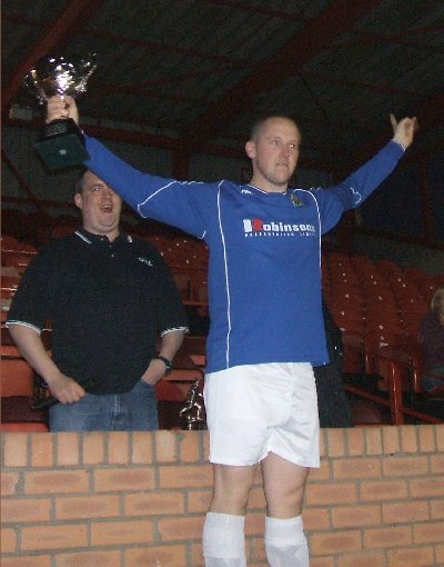 Right: Supporters' captain, Frazer Thorley, raises the trophy.