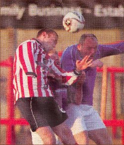 In an underhand tactic before kick off, Supporters' managers Eckersall and Jordan deployed a randomly numbered starting line-up to try and bemuse the Staff opposition about their formation. They need not have bothered as the Staff were sufficiently confused already, having not had any team training sessions beforehand. So to ensure that they at least had some idea of their own formation, the Staff used a more conventional numbering system. But, getting their excuses in before kick-off, the Staff made it clear that they would be severely handicapped without their accomplished centre-half, a.k.a. the Alty keeper Stuart Coburn. Stuart was reported to be sidelined by the back injury he had suffered last Saturday against Aldershot Town but the picture on the cover of the matchday programme (seen, right) told another story; it showed Stuart in action clearly lacking his right arm! Hopefully Stu will locate the limb before the start of next season.