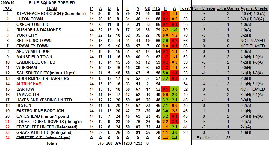 Conference National League Table 2009-10