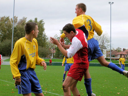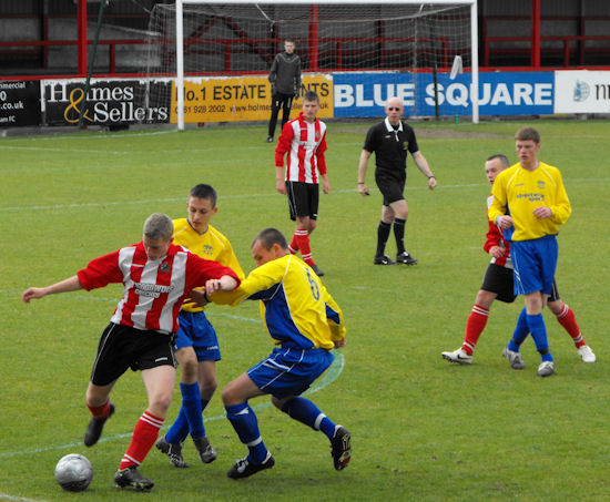 Pictured (right) is action from the game in which John Bennett (no.6) and Joel Brownhill for Alty Youth (in yellow) challenge the Juniors' no. 11 for possession, as Dan Shaw looks on. And the referee even wore sunglasses!