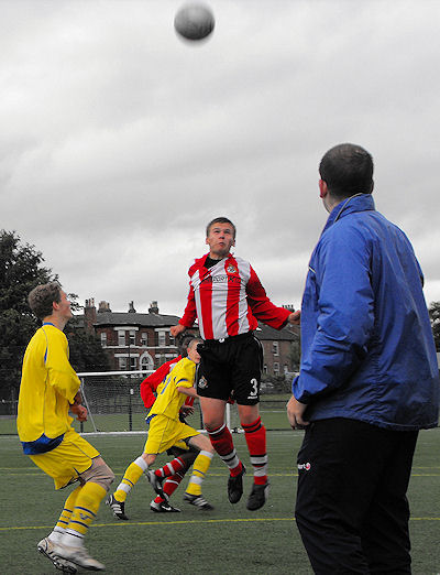 In this game, Altrincham were obliged to kick off early by the organizers which meant that two of the planned starters had to sit on the bench. Alty's Rory Bradbury saw a penalty saved, whilst Jamie Smart suffered a serious injury. Smart was penalised for a sliding tackle but he came off worse when the opponent's knee landed on the Alty man's head. Jamie was taken to Wythenshawe hospital, after a 12 minute delay on the bench, where a neck brace was applied. Fortunately he was later released from hospital but may now have to sit out tomorrow's games.